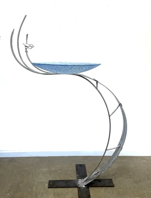 A stunning, elegant sculptural piece featuring a hand-slumped glass birdbath (12mm thick; heavy and strong).