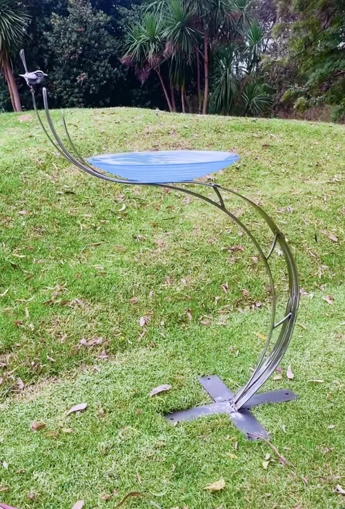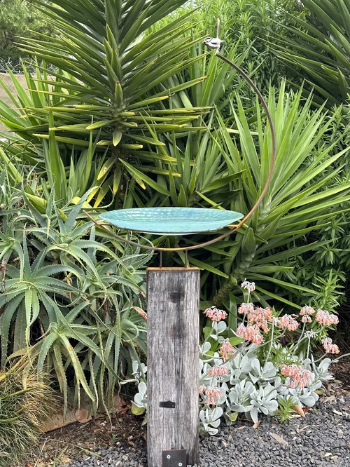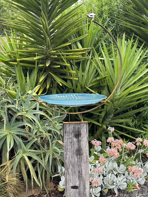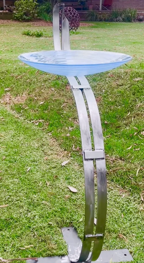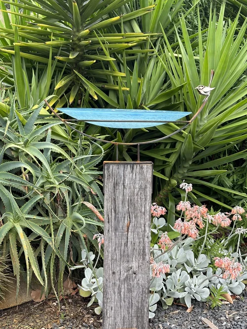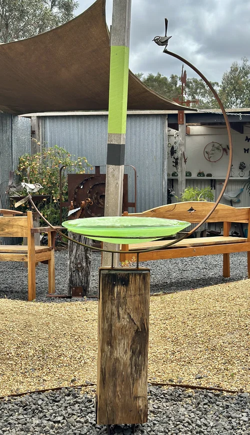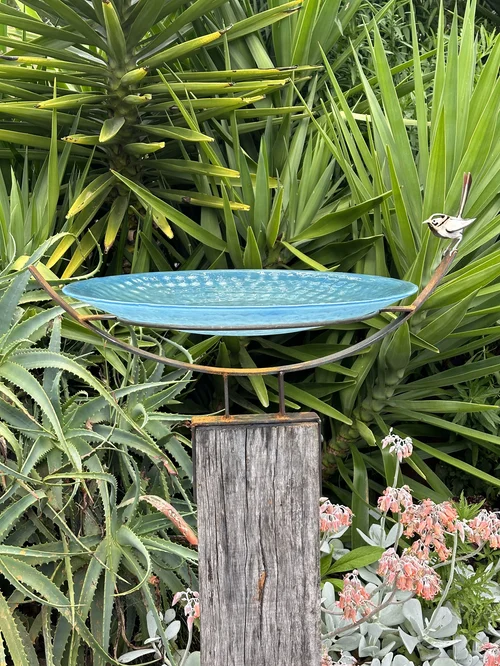 A stunning Australian-made bird bath by Grant Flather and Helen Wilkinson. Features a hand-slumped glass bowl (12mm thick - heavy and strong) by Helen Wilksinon. Each bowl is unique - available in light blue, medium blue or green.