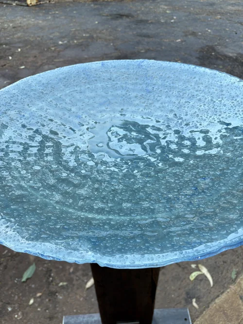 A stunning Australian made birdbath by Grant Flather and Helen Wilkinson. Features a hand-slumped glass bowl (12mm thick - heavy and strong) by Helen Wilksinon. Each bowl is unique - available in light blue, medium blue or green.