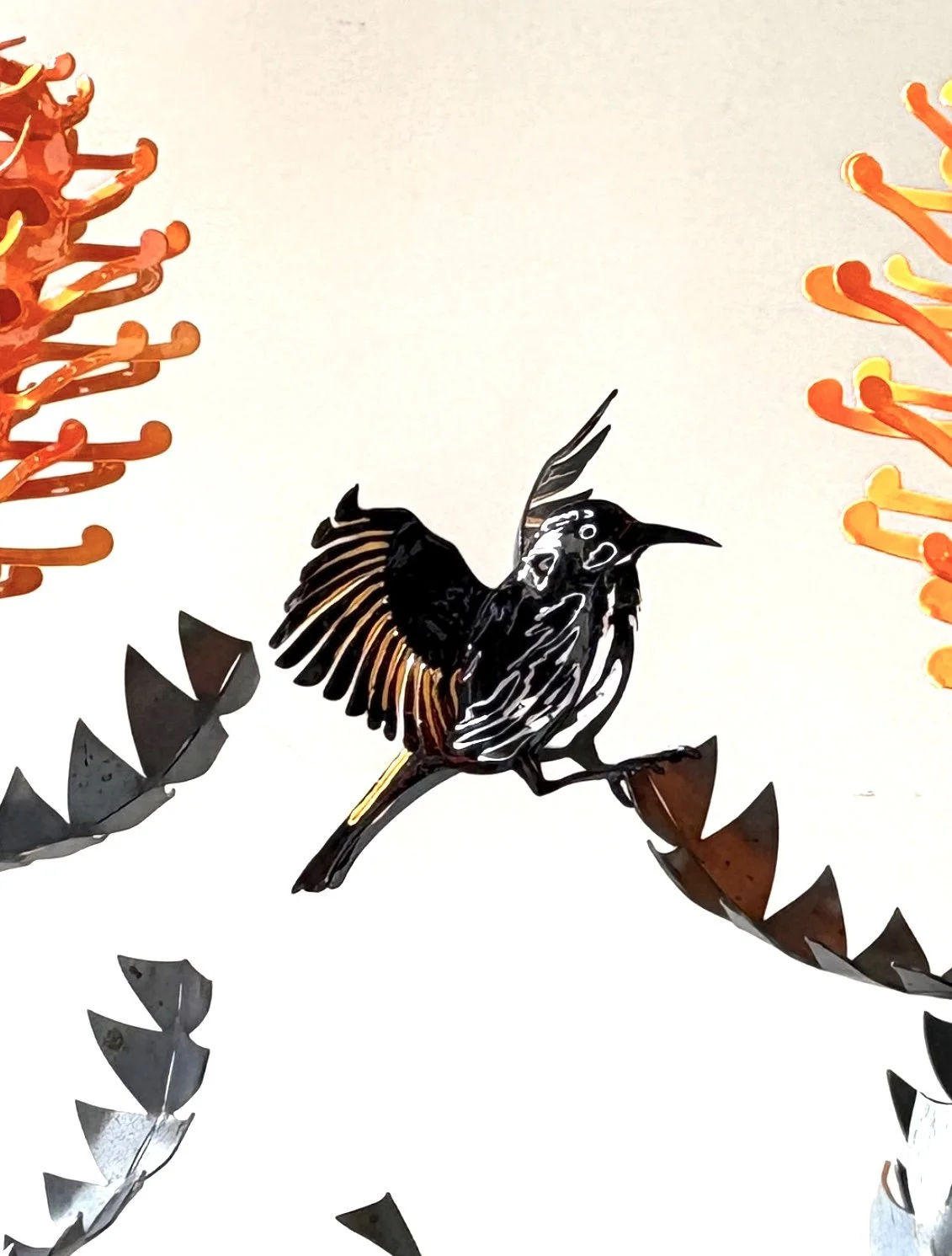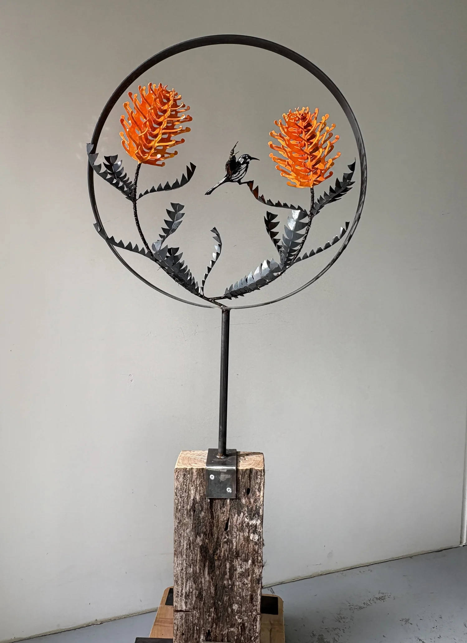 Double Standing Banksia Baxteri sculpture with bird by Grant Flather